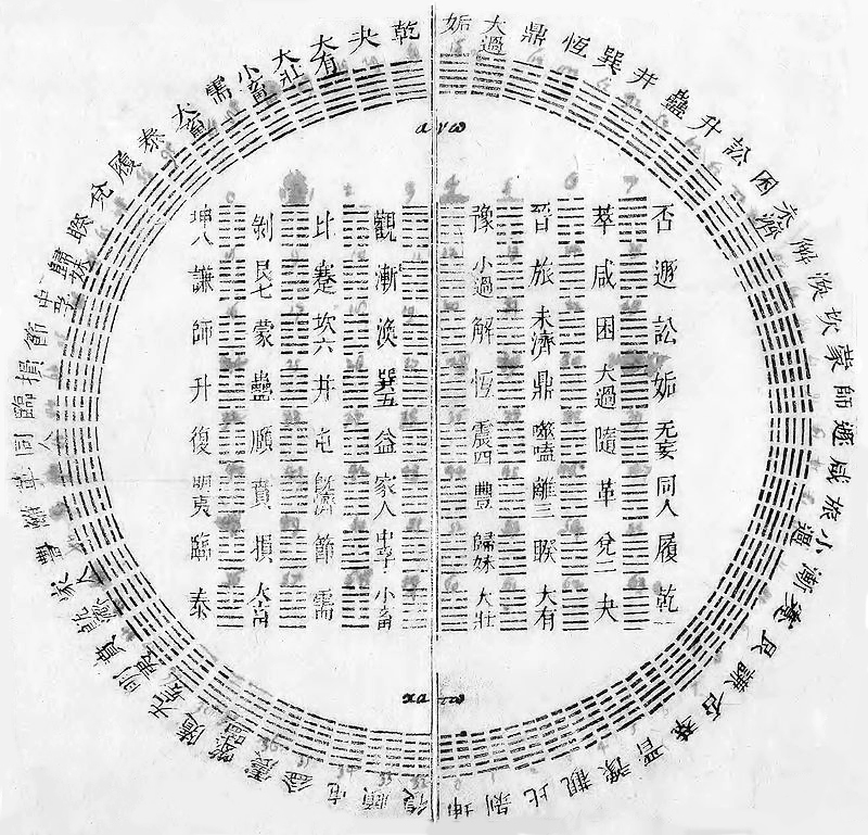《易經》伏羲先天六十四卦〈方圓四分四層圖〉。1701年萊布尼茨得自白晉的圖文,時為清康熙四十年。(公有領域)