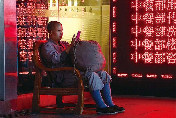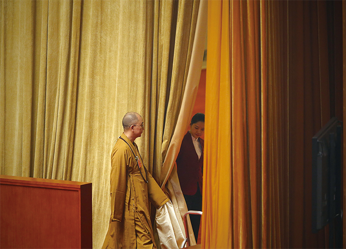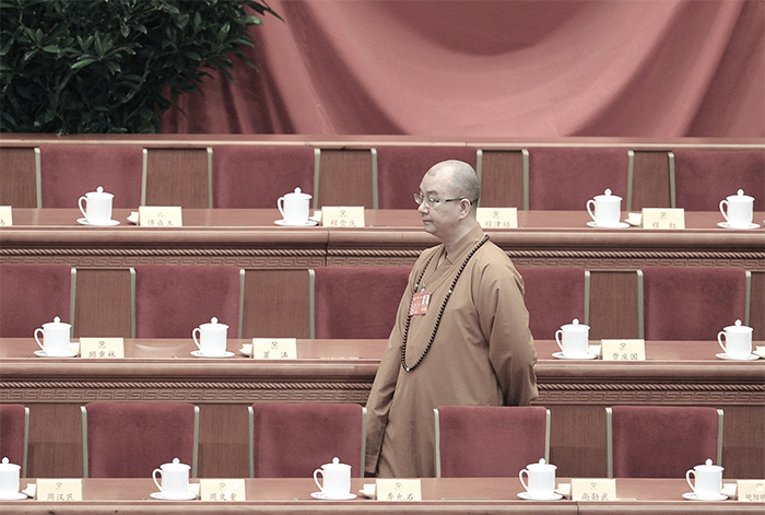 中共保留佛教的表面形式,卻毀滅其真正的內涵與精髓,而以中共的黨文化代之,使現代佛教如同畫皮一般,被中共穿上,用來迷惑世人。圖為2013年3月8日出席中共兩會的和尚。(Feng Li/Getty Images)