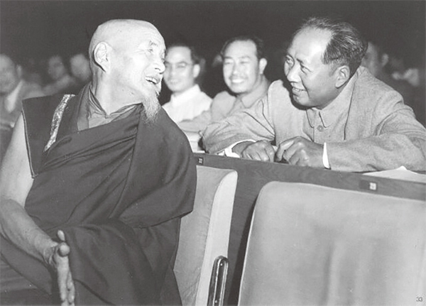 藏族僧人喜饒嘉措協助中共使用武力赤化青海和西藏,文革時卻挨了長達四年的批鬥,最終在獄中被折磨至死。圖為1954年中共人民代表大會期間,喜饒嘉措與毛澤東交談。(公有領域)