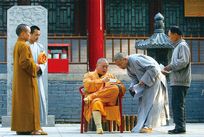 1999年,釋永信(圖中坐者)因追隨中共迫害法輪功「立下大功」而成為少林寺方丈及中協會副會長,一手打造少林寺商業王國,是外界公認的「政治和尚」。(Cancan Chu/Getty Images)