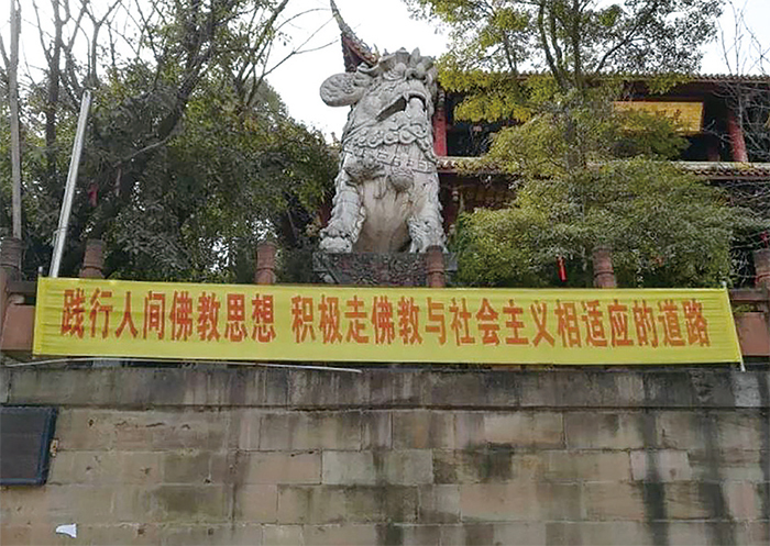 寺廟建築外掛著「踐行人間佛教思想積極走佛教與社會主義相適應的道路」令人無語的標語。(網路圖片)
