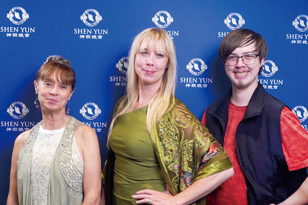 2021年8月3日晚,南達科他州參議員Jessica Castleberry(中)與母親和兒子一起觀看了神韻巡迴藝術團在當地的第一場演出。(新唐人電視臺)