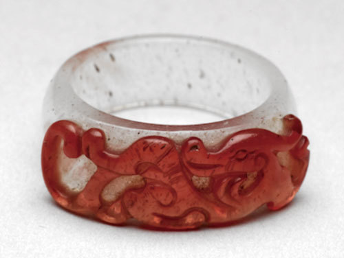 文字的記載,遠比重見天日的實物更為繽紛多彩。出現於古籍中的戒指,大多以價值連城的珍貴材料製成。比如《南史》記載,皇帝要納妃嬪,便賞賜金戒指。《北堂書鈔》中說,根據漢代舊儀,後宮妃嬪在侍奉皇帝時,會佩戴銀指環。《文獻通考》中記載,宋太祖時,東南亞的一個古國進貢了數不盡的奇珍異寶,其中之一是水晶指環。《廣博物誌》中有琥珀指環;《說郛》中出現了金剛石指環和翡翠指環。當真是琳琅滿目,美不勝收。