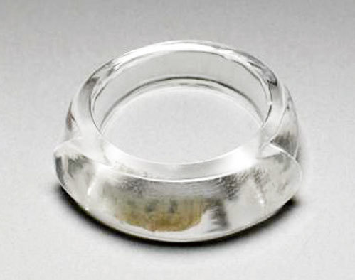 清 水晶戒指。水晶戒作馬鞍式,戒面呈長弧形,略突出戒環之外。透明光素無紋。(臺北故宮博物院提供)