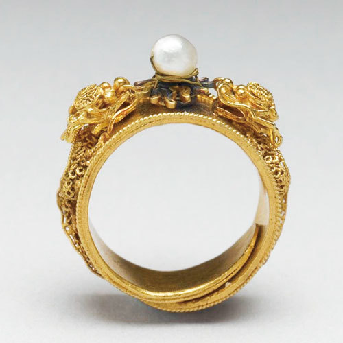 清 金纍絲雙龍戲珠戒指。戒環上飾金纍絲雙龍紋及雲紋,中心火焰座上嵌珠一。戒環可伸縮。(臺北故宮博物院提供)
