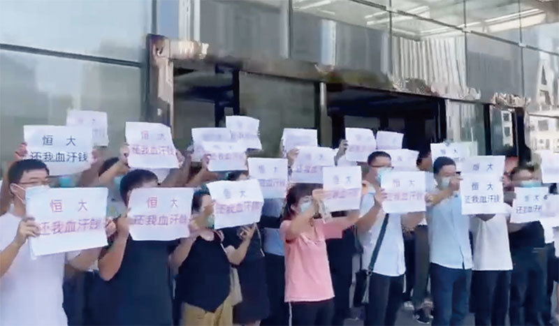 恒大出事,公司高層的一些資產開始轉移,其他普通投資者很可能是最後被照顧的債權人了。圖為9月10日,恒大員工在企業總部前聚眾高喊「恒大還我血汗錢」。(影片截圖)