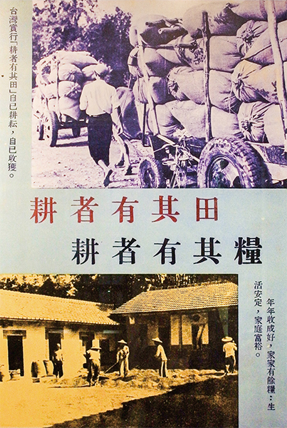 臺灣的土地改革成功地以不流血的方式實現耕者有其田,為臺灣後來成為亞洲工業四小龍奠定了基礎。圖為民國50年代耕者有其田與耕者有其糧的廣告文宣。(HuKi001/維基百科)