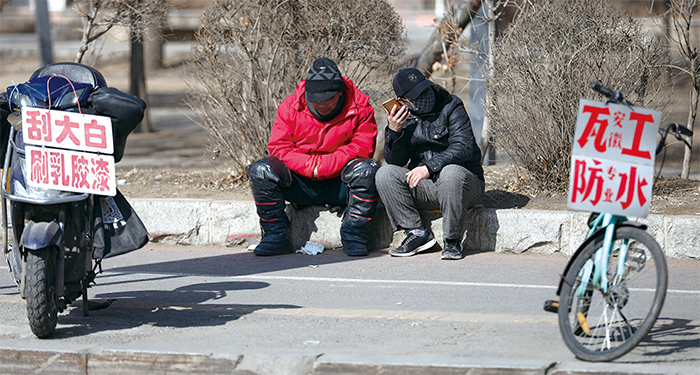 從農村到城市的農民工,既是農民、又是工人。他們本應是五星紅旗上兩顆星的共同代表,但被稱為「城市低端人口」到處驅趕。圖為2021年2月25日瀋陽市農民工在街邊尋求工作機會。(STR / AFP)