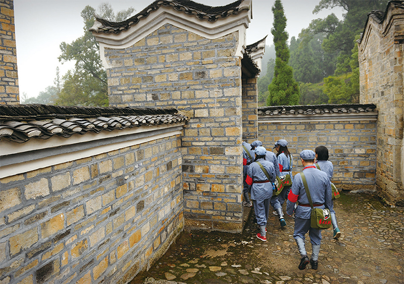 國民政府「剿匪」期間,被圍剿的中共四處流竄,後來到井岡山落腳。圖為2012年9月21日,穿著紅軍士兵服裝的遊客遊歷井岡山中共革命根據地舊址。(Peter Parks/AFP)