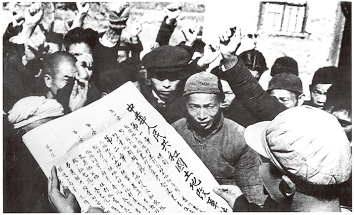 中共篡政後僅三個月,就開始在全國進行「土地改革」。圖為1950年,一人向群眾宣讀《中華人民共和國土地改革法》。(公有領域)