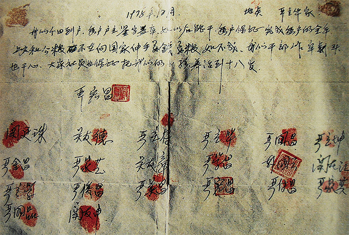 在快餓死的情況下,安徽小崗村的18位農民於1978年立下「生死狀」,大意是為了能吃口飯活下去,大家違反國家的規定將村內土地分開承包,如果被抓被殺,家裡的妻兒老小就讓別人幫著養。村民為了活命而玩命的行為,開創了「家庭聯產承包責任制」的模式。1979年這18位農民的收入比上年增長了六倍。