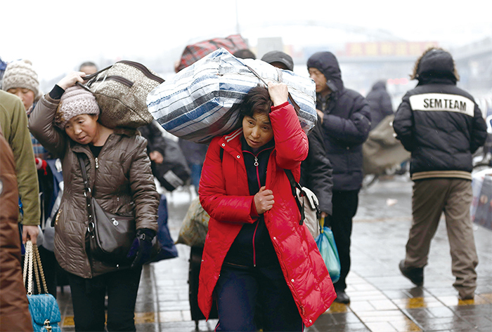 中國逐漸成為世界工廠,需要大量工人,農村的勞動人口快速流向工廠集中的都會地帶,成為所謂的「農民工」。圖為2013年1月31日抵達北京火車站的農民工。(Lintao Zhang/Getty Images)