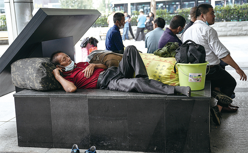 據統計,到2020年底,全中國的農民工總數約有2.856億人,占總人口的五分之一。圖為2020年9月16日,中國湖北省武漢市,農民工戴著口罩躺在漢口火車站外的臺階上。(Getty Images)