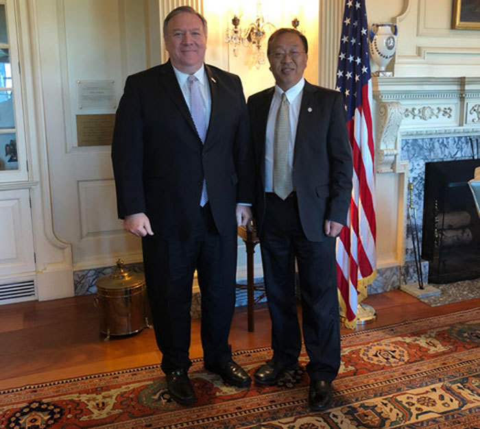 中共病毒疫情剛爆發時,在美國國務院政策規劃辦公室任職的余茂春(右)下載了武毒所網頁的副本。前美國國務卿蓬佩奧(左)6月證實,他致力於查清病毒來源時,遭到美國政府內部的激烈反對。(公有領域)