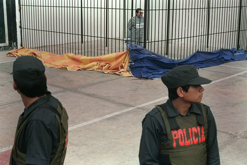 1992年9月24日,被捕13天後,關進籠子裡的毛派光輝道路游擊隊頭子古斯曼,出現在祕魯公眾和國際媒體面前。(Hector Mata / AFP)