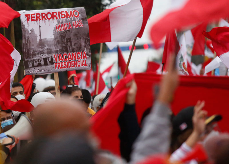 2021年9月12日,在祕魯恐怖組織「光輝道路」前領導人古斯曼去世後,在利馬商業區舉行的反恐怖主義示威活動中,一條寫有「再也沒有恐怖主義」的橫幅。(Gian Masko / AFP)