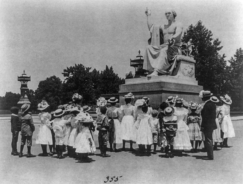 1899年的美國首都華盛頓,一群小學生們站在霍雷肖.格里諾的「喬治.華盛頓像」前。照片由F.B. Johnston拍攝,國會圖書館。(公有領域)