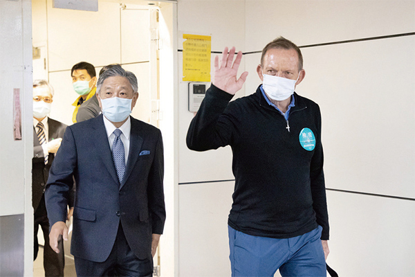 澳洲前總理阿博特(Tony Abbott)(右)10月5日下午抵達桃園國際機場。(中央社)
