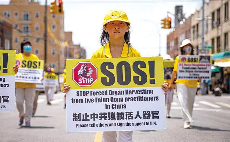 2013年孫力軍任「610辦公室」副主任後,積極迫害法輪功學員,據統計,2013年至少76名大陸法輪功學員被迫害致死。圖為2021年7月18日,美國法輪功學員在紐約布魯克林遊行反迫害,呼籲制止中共活摘器官。(Chung I Ho/The Epoch Times)