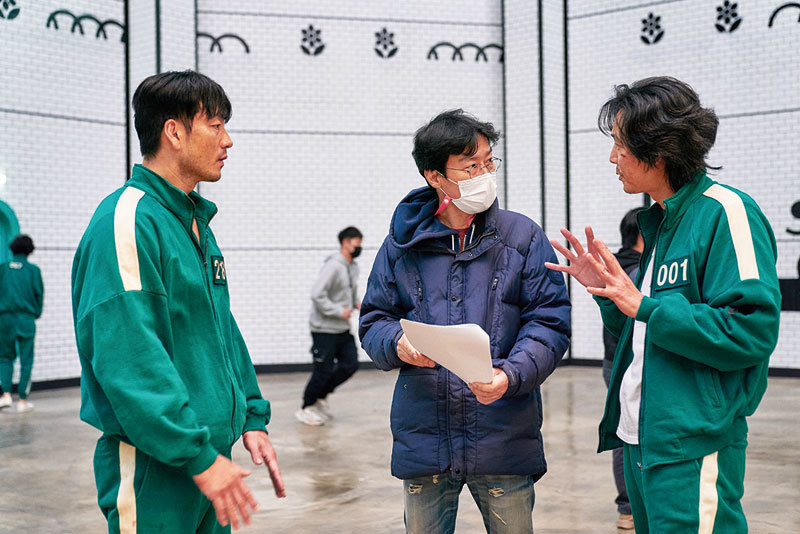 韓國導演黃東赫(中)在《魷魚遊戲》第一季的拍片現場,與主角飾演成奇勳的李政宰(右)和飾演曹尚佑的朴海秀(左)交流。(Netflix / AFP)