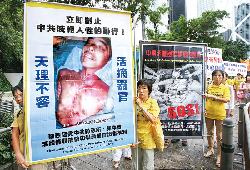 《魷魚遊戲》劇中,有基層士兵把還沒死去的參賽者送去活摘器官後賣掉,跟中共對法輪功學員活摘器官是一模一樣。圖為2006年6月28日香港法輪功學員遊行呼籲制止中共活摘器官。(Mike Clarke/AFP)