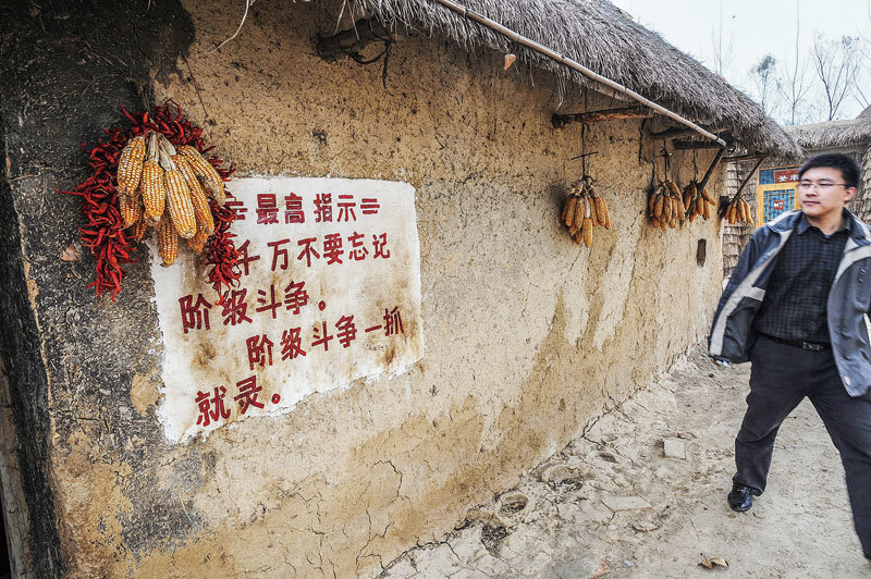 階級鬥爭是共產黨的政治哲學,先分化人民,再挑動群眾鬥群眾,摧毀人與人之間的信任。圖為2008年12月3日,中國改革開放發源地之一安徽省小崗村,一面牆上寫著「永遠不要忘記階級鬥爭」。(STR / AFP)