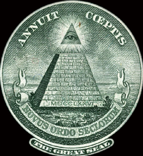 當遊戲的最後三名參賽者一起吃飯時,餐桌的設計是一個大的三角形,這個三角形跟某個神祕組織的「全知之眼」很像,而且在一美元的美鈔背後,也有這個圖案。(公有領域)