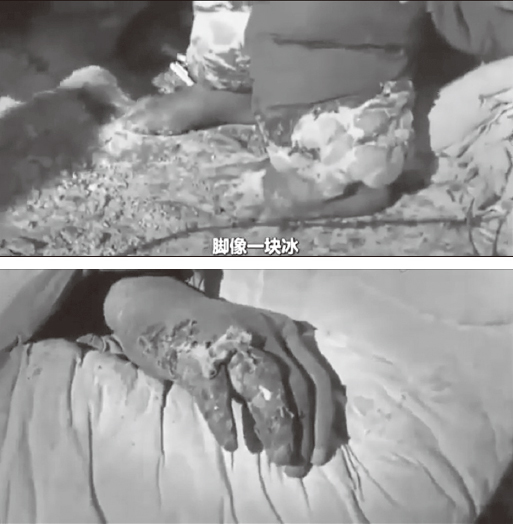 美軍感受到志願軍經歷了比自己更可怕的處境,所以發自內心去關懷這些戰俘。圖為自願軍手腳嚴重凍傷。(視頻截圖)