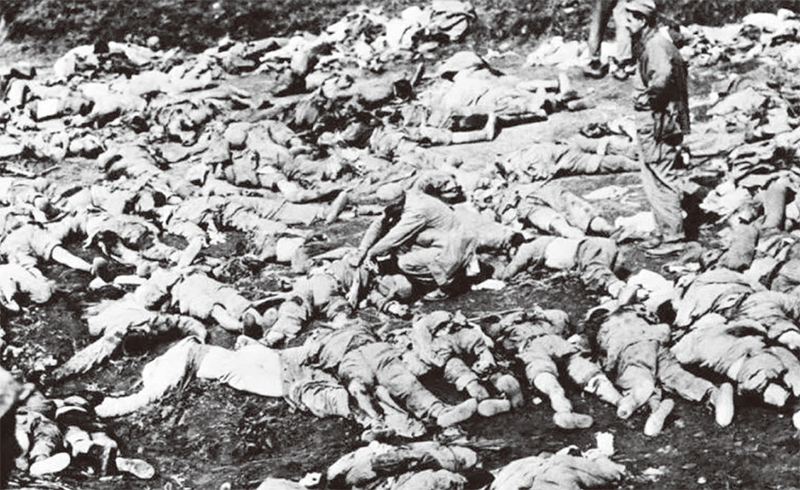 中共依靠人海戰術,用自願軍肉身擋子彈。美軍不斷的射擊,卻無法阻止志願軍形同自毀的前進,最後屍橫遍野。(視頻截圖)