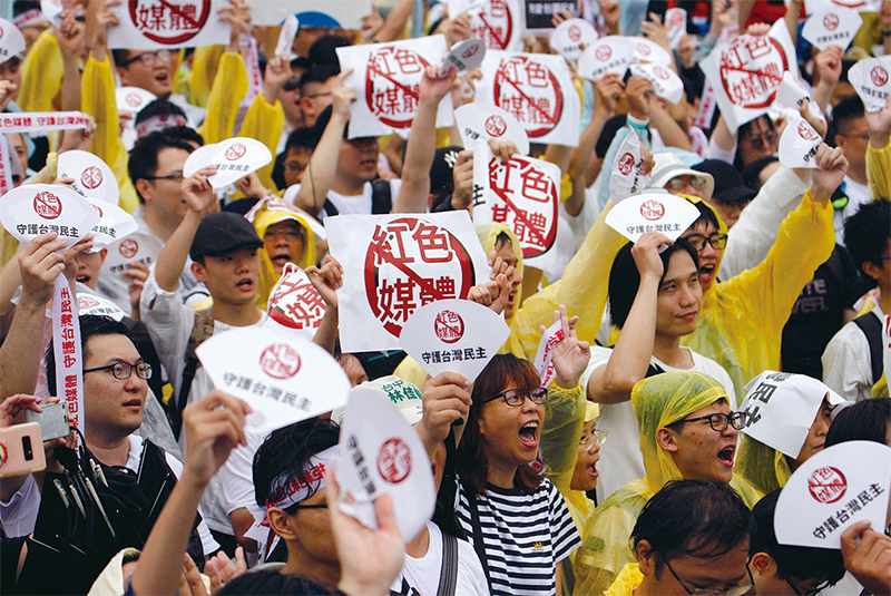 如今臺灣也面對中共利用認知戰操弄假訊息、網路戰等等方式,削弱臺灣人的抗敵意志。圖為2019年6月23日,臺北舉行一場名為「拒絕紅色媒體、守護臺灣民主」的遊行。(Hsu Tsun-hsu / AFP)