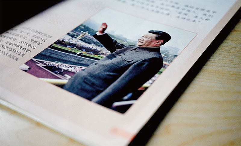 中共六中全會要通過一個歷史決議,做了很多宣傳,目的就是要把習近平放上共產黨的神臺上去,其他都不重要。圖為一本小學教科書上,習近平的插圖和語錄。(Noel Celis / AFP)