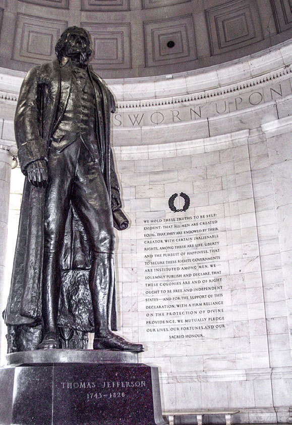 傑佛遜在起草《美國獨立宣言》時寫了三大權利:生存的權利、自由的權利和追求幸福的權利。圖為位於華盛頓特區傑佛遜紀念堂內的傑佛遜雕像。(Karen Bleier / AFP)