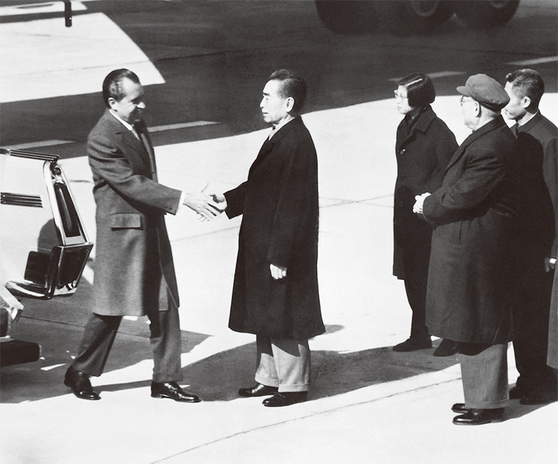 為尋求連任、從越戰脫身、聯中共制俄共,美國總統尼克松急欲拉攏中共。圖為1972年2月中國總理周恩來(右)歡迎美國總統尼克松於抵達北京進行正式訪問。(AFP)