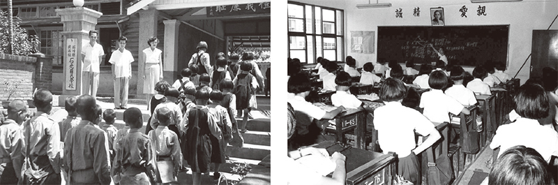 中華民國政府遷臺後,繼續推動六年制的義務教育,到1968年延長為九年義務教育。左圖為新竹縣關西鎮石光國民學校。右圖為教室的標準樣式。(國家發展委員會檔案管理局提供)