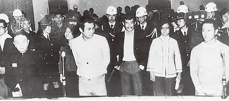 「美麗島事件」是臺灣在政治與社會上,從威權封閉走向民主開放的一次具有里程碑性質的事件。圖為美麗島大審的受審者(位於臺灣警備總司令部軍法處第一法庭)。(新台灣研究文教基金會╱維基百科)