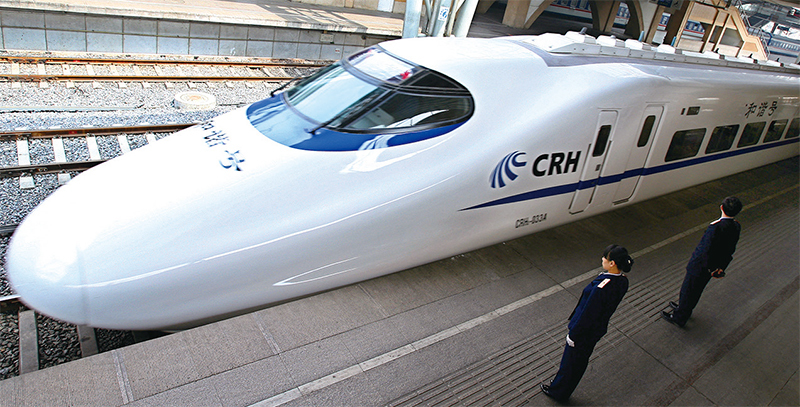 2003年中共招引四家世界頂尖的高鐵企業進入中國,拿到技術後不到三年就完成整套系統的複製工程。圖為2007年4月18日,一列中國鐵路高速子彈列車從北京市中心的車站出發。(Teh Eng Koon / AFP)