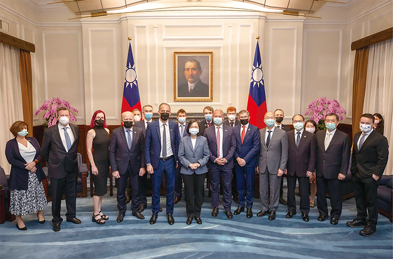 越來越多的國家支持臺灣進入國際組織,並與臺灣發展進一步的關係。圖為臺灣總統蔡英文2021年11月4日在總統府與「歐洲議會『外來勢力干預歐盟民主程序(含假訊息)』特別委員會官方代表團」會晤後合照。(總統府提供)