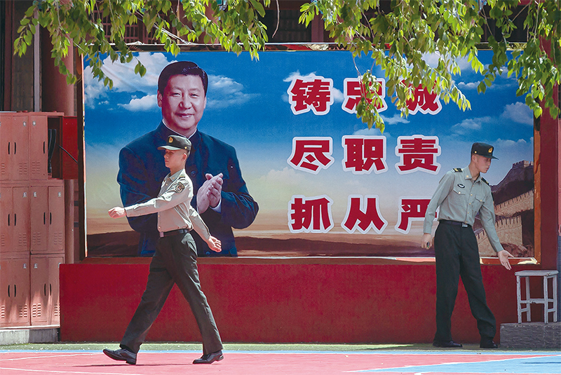 近年,中國大陸民眾拒服兵役的事件頻現官媒報導,即便嚴厲懲處,也難阻嚇。2020年5月18日,兩名中共解放軍在掛有習近平海報的北京紫禁城入口處。(Nicolas Asfouri / AFP)