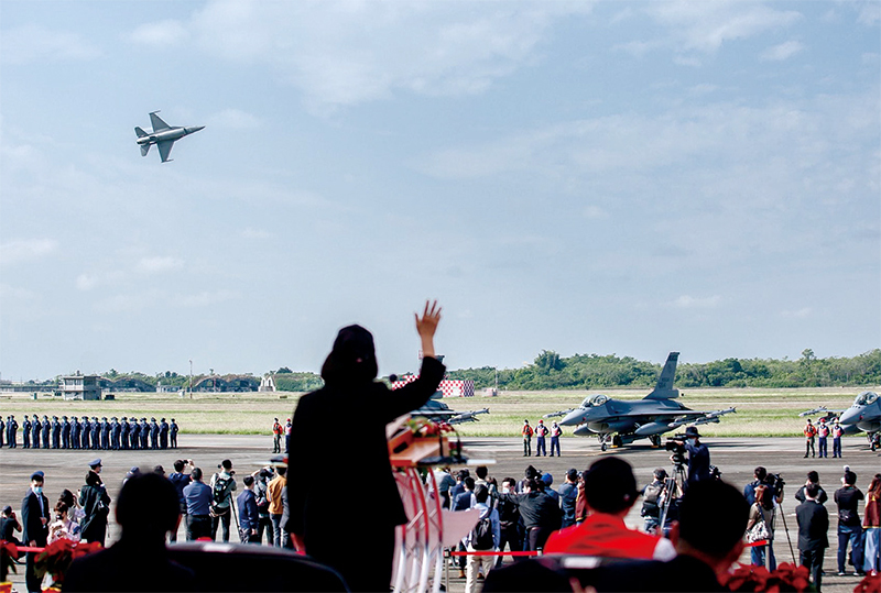 面對中共威脅,臺灣先進的F-16V作戰隊成軍。圖為中華民國總統蔡英文2021年11月18日在嘉義空軍基地出席「F-16V BLK20型機性能提升接裝典禮」。(臺灣總統府提供)