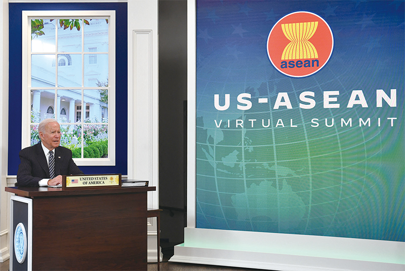 2021年10月26日,美國總統拜登在東盟峰會上承諾,重申美國對臺灣「堅如磐石」的支持。(NICHOLAS KAMM/AFP)