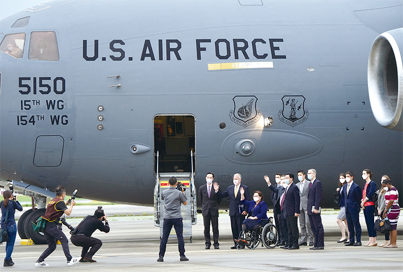 在一系列親臺和反中共立法背景下,美國國會議員公開訪問臺灣。圖為2021年6月6日,三名美國參議員乘坐美國空軍貨機抵達臺灣。(Aden Hsu / AFP)