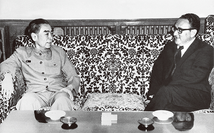 基辛格於1971年7月祕密訪問北京。美國一方面藉由中美共同防禦條約防護臺灣的安全,另一方面也牽制蔣介石反攻大陸,避免將美國拖入戰爭。圖為基辛格(右)於1971年7月在北京會見周恩來。(AFP Files)