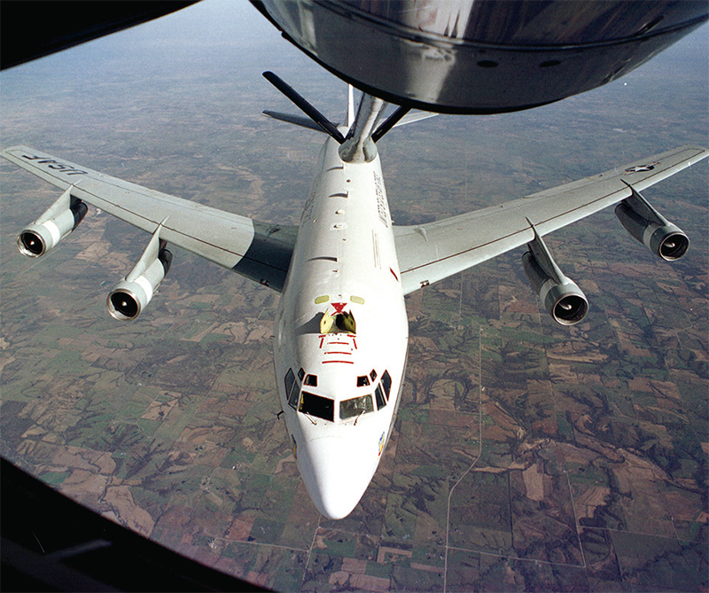 2021年10月31日,中共六中全會前夕,臺海局勢緊張之際,美軍專門偵測核爆的WC-135W偵察機時隔一年再次現身南海。圖為一架WC-135正在接近加油機。(U.S. Air Force)