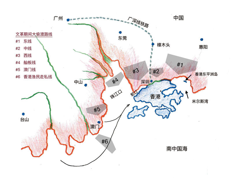 四個步驟,首先你要過關,過警察關和民兵關;然後你就「埋堆」,就是你要藏起來,等天黑了,一定要有人幫你或者自己把路上吃的糧食帶進去;然後下一個就是翻山越嶺;最後一個步驟,就是過海去香港。