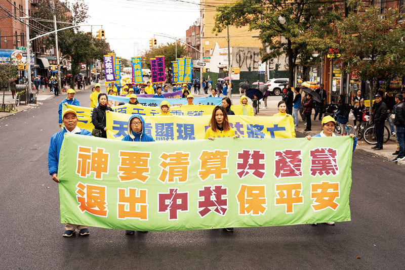 2019年10月20日,紐約部分法輪功學員在布魯克林舉行遊行,聲援3億4000多萬勇士三退(退出中共黨、團、隊)。(戴兵/大紀元)