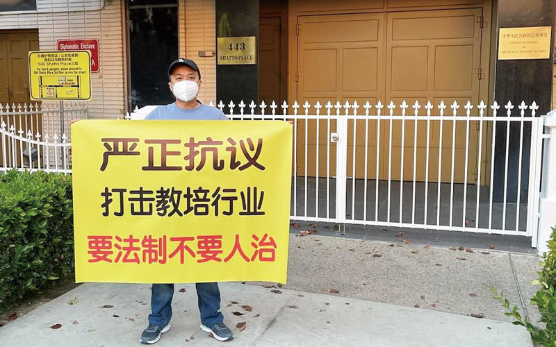 旅美教培業者Zayn認為,培訓機構基本上都是引進國外教材,不可避免的就把國外的價值觀、普世價值帶進來,這是官方特別忌諱的東西。圖為2021年9月15日,Zayn在洛杉磯中領館前抗議中共嚴打教育培訓行業。(Zayn提供)