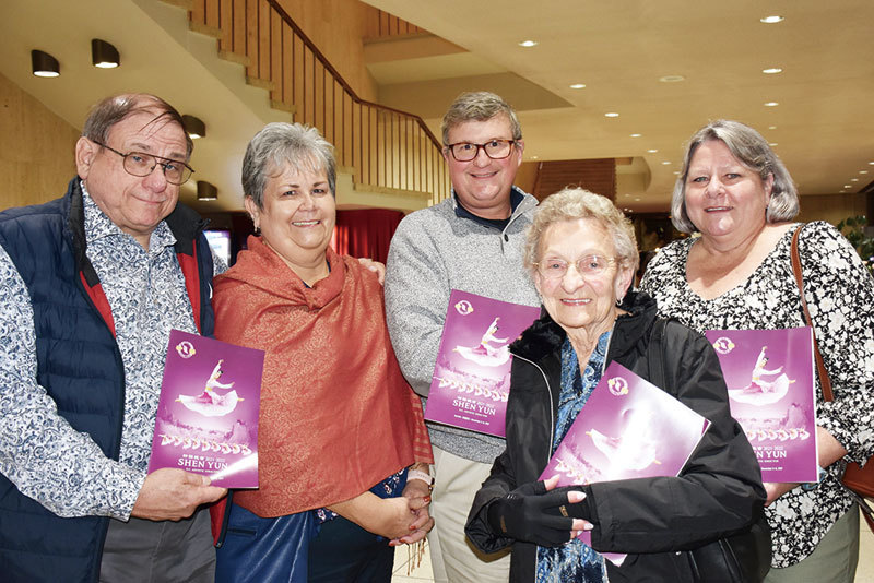 前美國海軍樂團負責人Patricia Crimmins(右一)和先生Paul Crimmins(右二),與退休的海軍安全總監Bill Higgins(左一)、其夫人Elizabeth Higgins(左二),以及Higgins的母親一行五人,前來弗吉尼亞州諾福克市觀看神韻演出。(攝影/樂原)
