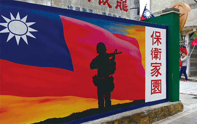 2020年10月金門群島一處牆面上繪有的保衛家園的壁畫。(Sam Yeh / AFP)