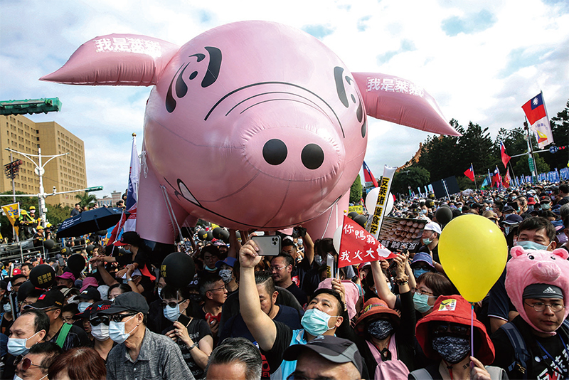 明居正表示,中共藉由渲染美國的牛和豬都是有毒的,挑撥反美情緒,以進行統戰。圖為2020年11月22日在臺北一場遊行裡反對進口美國萊豬的隊伍。(Hsu Tsun-Hsu / AFP)