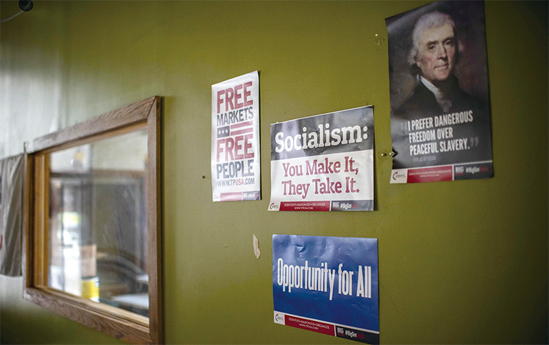 「進步主義」與「自由主義」、「社會主義」、「共產主義」是同一棵樹上的果子,目的是要摧毀美國的傳統價值觀,毀滅是非善惡的標準。圖為2020年8月12日一處共和黨人競選辦公室牆上的標語:社會主義是你創造、它享有。(Eric Baradat / AFP)
